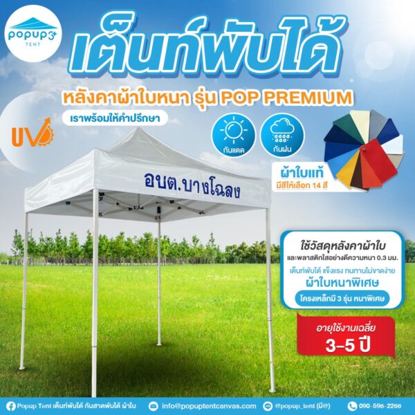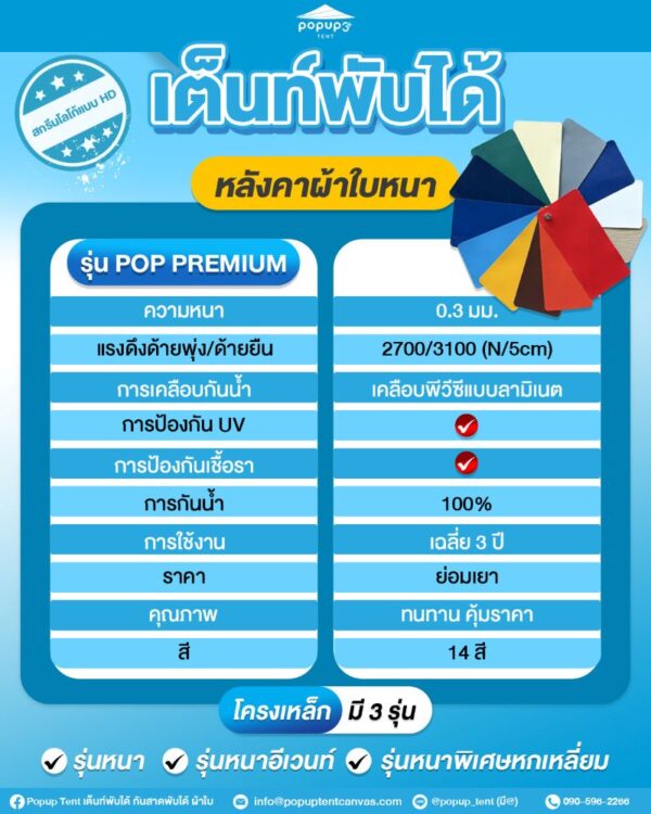 ▫️เต็นท์พับได้หลังคาผ้าใบแบบหนา รุ่นใหม่ รุ่น POP PREMIUM ใช้วัสดุหลังคาผ้าใบ และพลาสติกใสอย่างดี ความหนา 0.3 มม. มีให้เลือก 14 สี มีคุณสมบัติป้องกันแดด รังสี UV และกันฝนได้ดีมาก เคลือบกันน้ำพีวีซีแบบลามิเนต ป้องกันเชื้อรา อายุการใช้งานเฉลี่ย 3-5 ปี มากกว่าเต็นท์พับทั่วไป