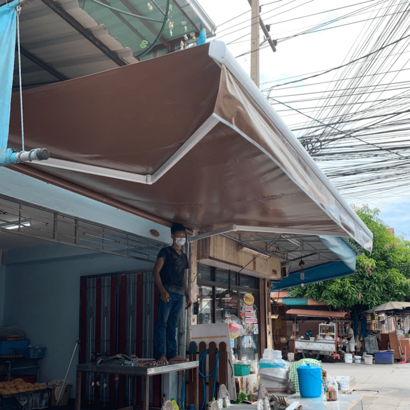 กันสาดพับได้ช่วยกันแดดกันฝนได้ดีเยี่ยม และทำให้อาคารมีความเรียบร้อยสวยงาม ผ้าใบกันสาด มีดีไซน์ สามารถสกรีนโลโก้ที่กันสาดเพิ่มได้ ช่วยสร้างแบรนด์ ส่งเสริมภาพลักษณ์ไปในตัว